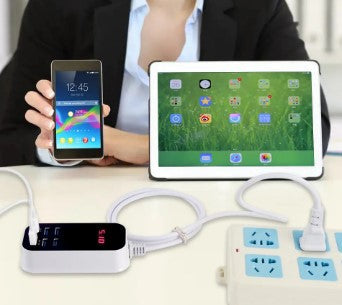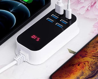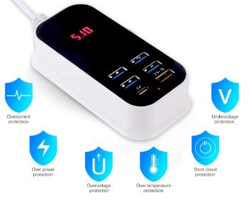 O carregador rápido com 6 portas USB e display LED é um dispositivo projetado para carregar múltiplos dispositivos eletrônicos de forma rápida e conveniente.
